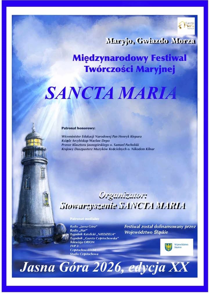 Zachęcamy do zgłaszania się do udziału w Międzynarodowym Festiwalu Twórczości Maryjnej 'Sancta Maria' na Jasnej Górze w Częstochowie, edycja 2026 pod hasłem: "Maryjo, Gwiazdo Morza".